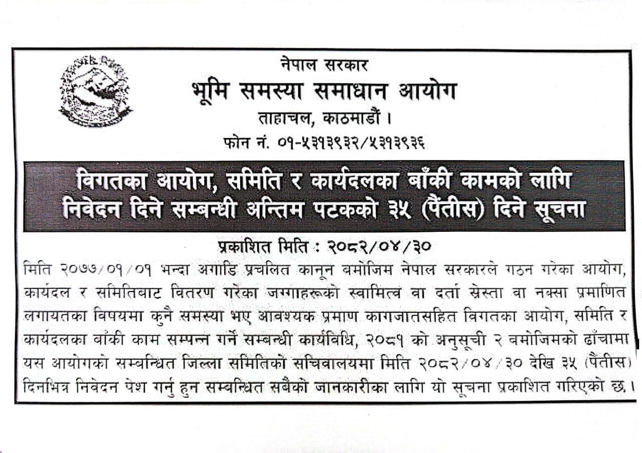 विगतका आयोग, समिति र कार्यदलका बाँकी कामको लागि निवेदन दिने सम्बन्धी अन्तिम पटकको ३५ (पैंतीस) दिने सूचना (प्रकाशित मिति : २०८२/०४/३०)