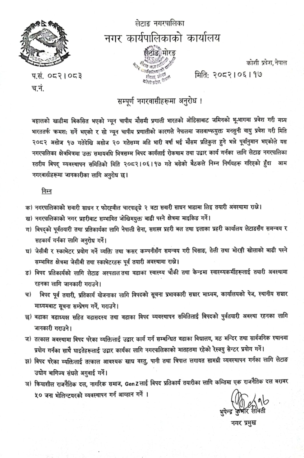 सम्पुर्ण नगरवासीहरुमा अनुरोध । (२०८२।०६।१७)