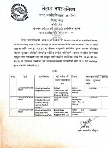 बोलपत्र स्वीकृत गर्ने आसयको सार्वजनिक सूचना। सूचना प्रकाशित मितिः २०८२।१०।०८