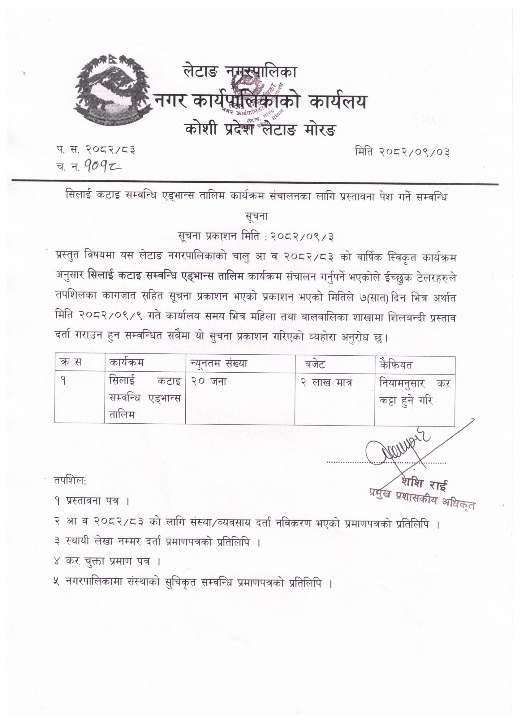 सिलाई कटाइ सम्बन्धि तालिम कार्यक्रम संचालनका लागि प्रस्तावना पेश गर्ने सम्बन्धि सूचना।