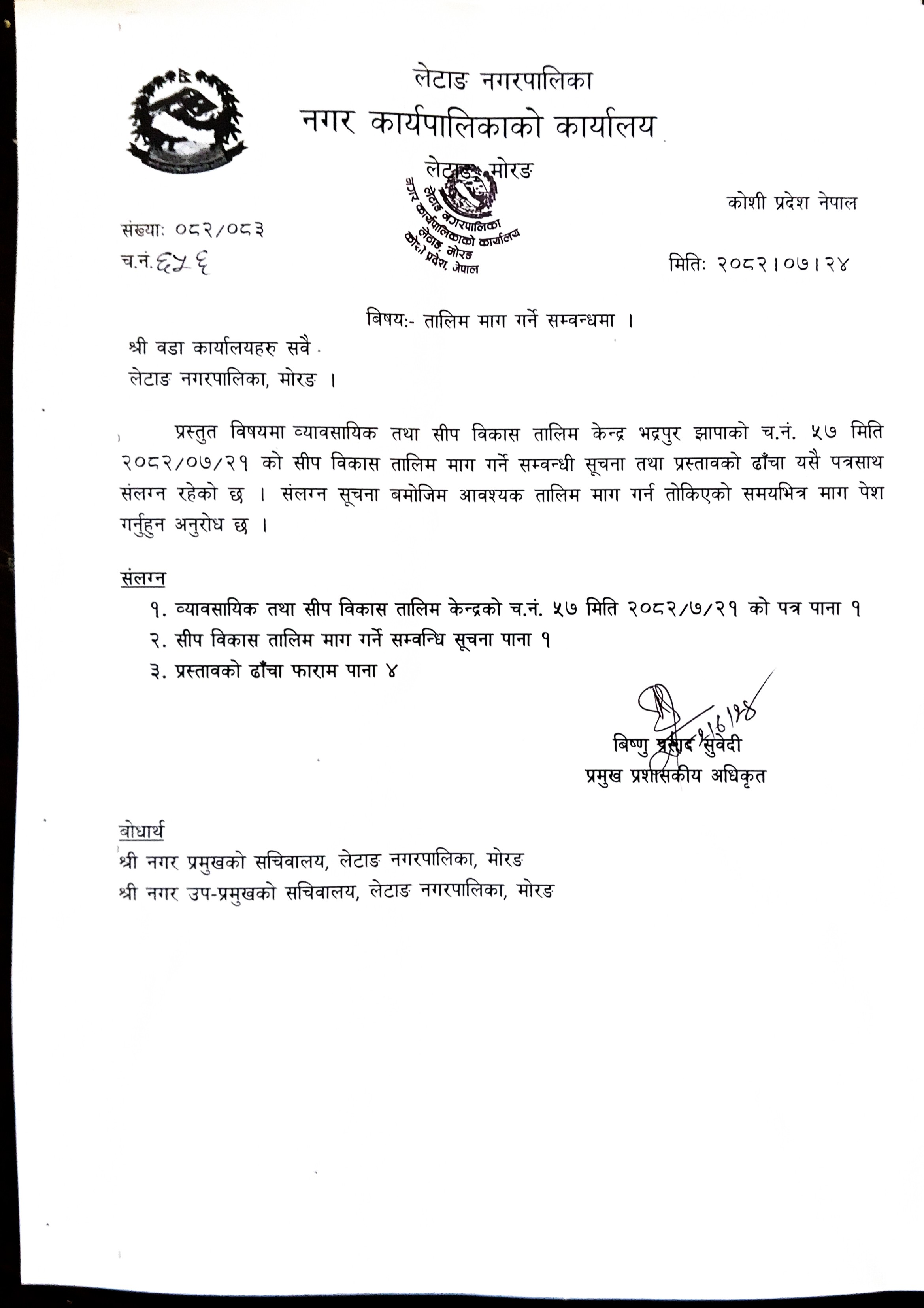 तालिम माग गर्ने सम्बन्धमा । (प्रकाशन मिति २०८२।०७।२४)