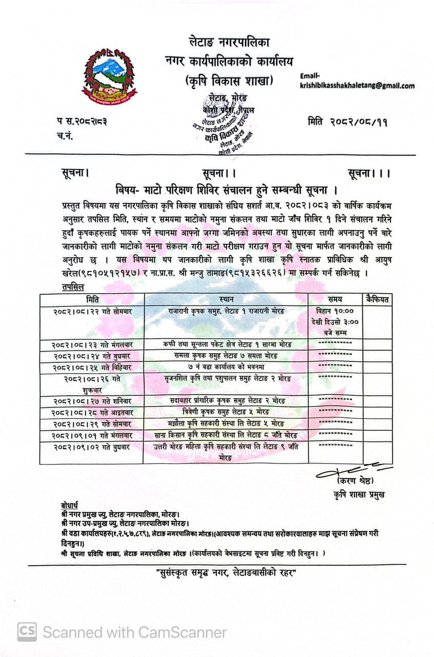 माटो परिक्षण शिबिर संचालन हुने सम्बन्धी सूचना । (प्रकाशित मितिः२०८२।०८।११)