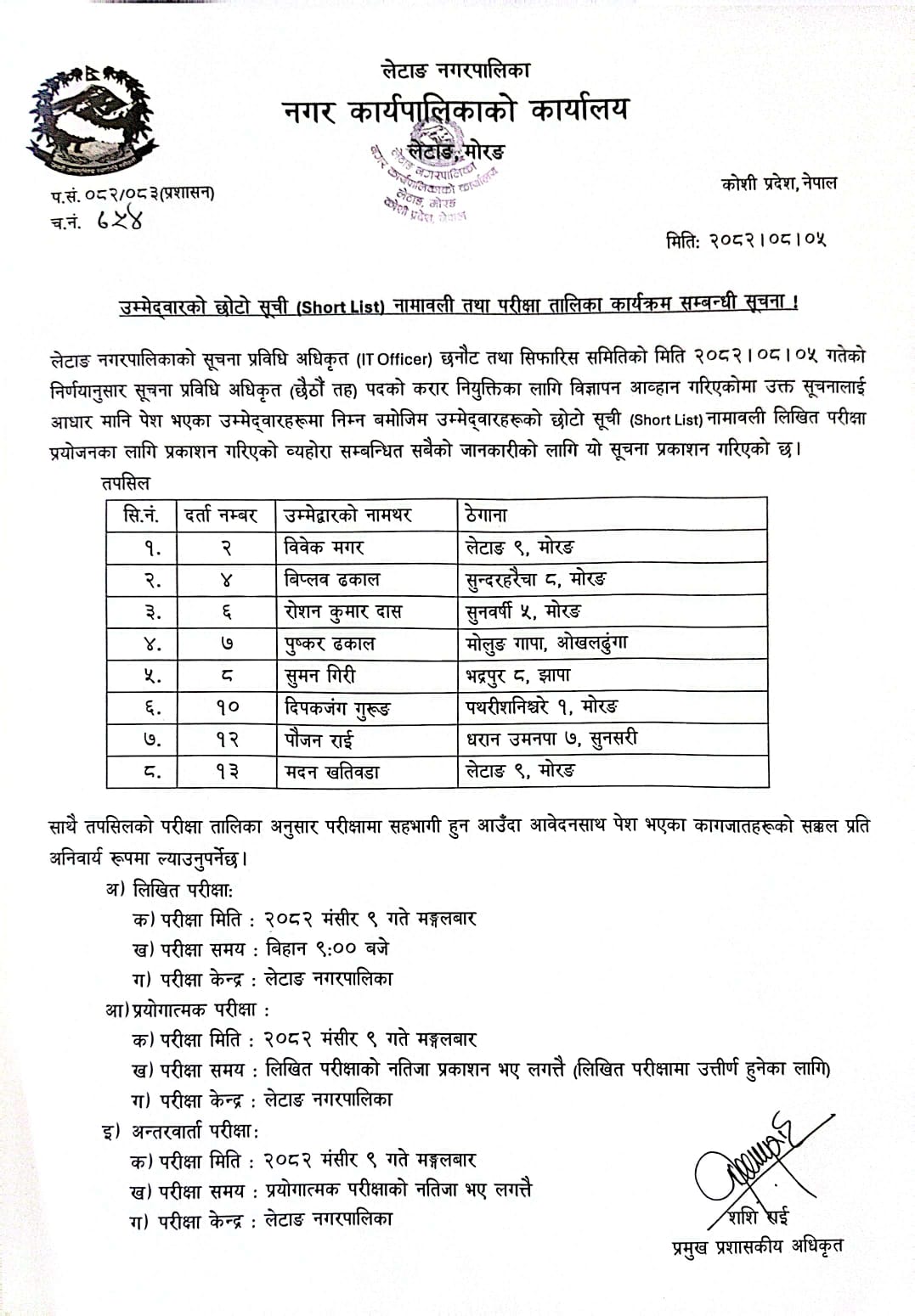 उम्मेद्वारको छोटो सूची (Short List) नामावली तथा परीक्षा तालिका कार्यक्रम सम्बन्धी सूचना । (प्रकाशन मितिः२०८२।०८।०५)